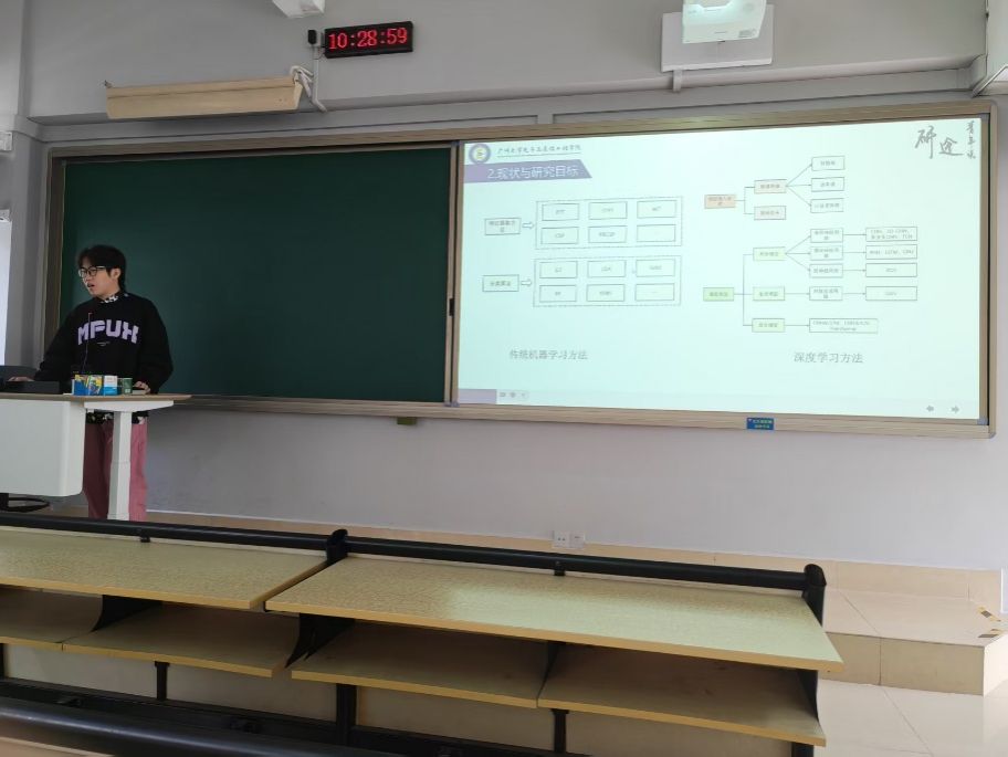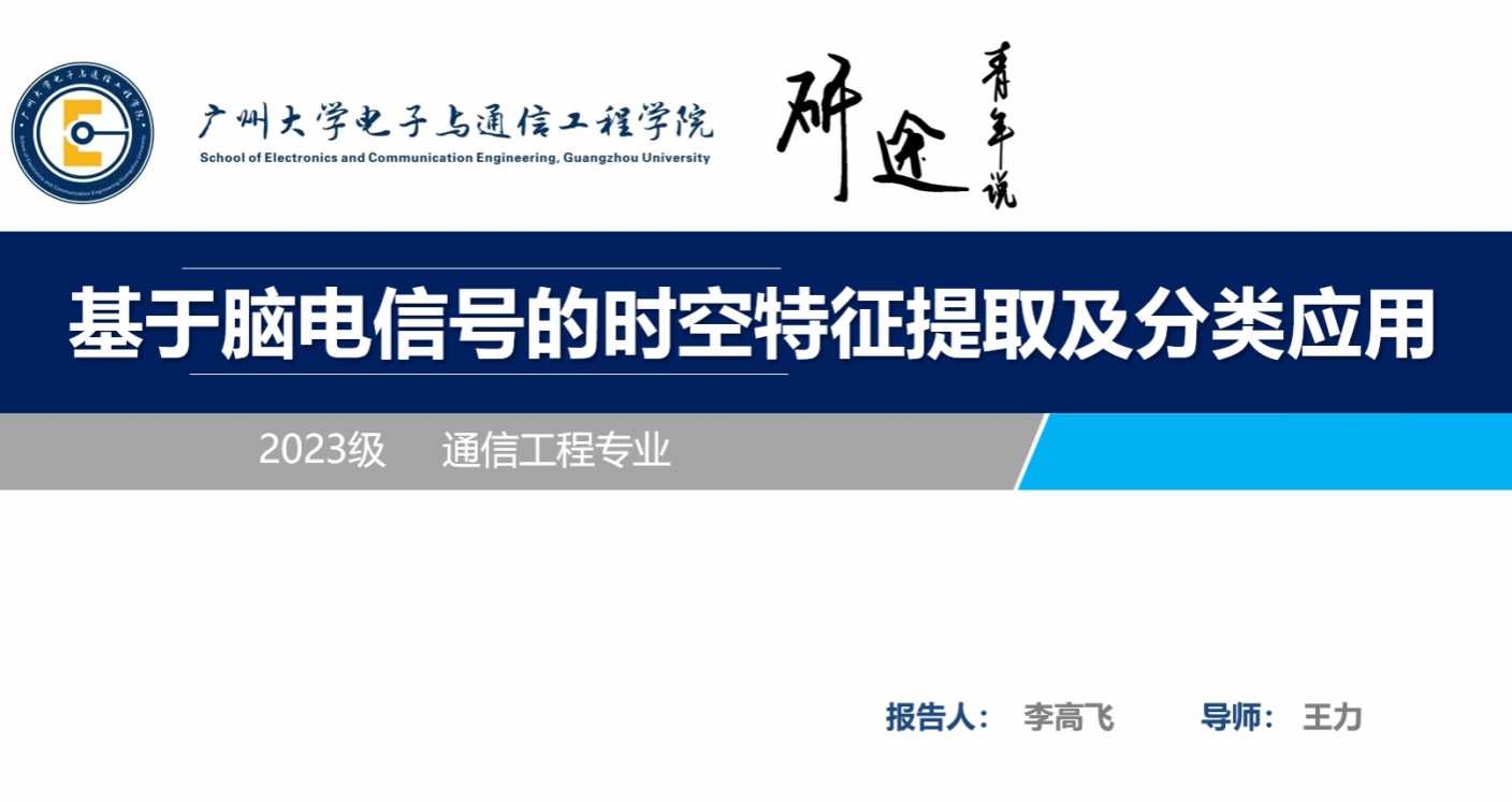 李高飞同学汇报的主题是基于脑电信号的时空特征提取及分类应用,他的讲解主要包含以下5个部分:选题背景及意义、现状与研究目标、研究方法及过程、研究结果与应用、论文总结。研究面向运动想象脑机接口,构建深度学习多分支网络提升EEG解码精度。加入SE通道注意力筛选关键电极;提出Li-TCN模块,将轻量多尺度线性注意力LiteMLA与TCN时序卷积残差融合,实现全局感受野与多尺度时间特征同步捕获;辅以时间域S&R数据增强,扩充样本并保留时序结构,有效抑制小样本过拟合。在BCIC IV 2a公开数据集跨会话评估中,所提模型平均准确率79.21%,K系数0.71;会话内测试进一步提升至81.36%与0.75,均显著优于EEGNet、ATCNet、DeepConvNet等基准,标准差降至9%以内,显示良好稳定性与泛化能力。研究为高精度、低样本BCI系统提供新思路。