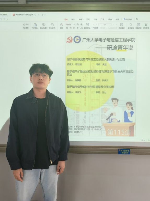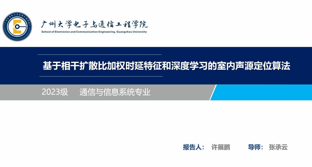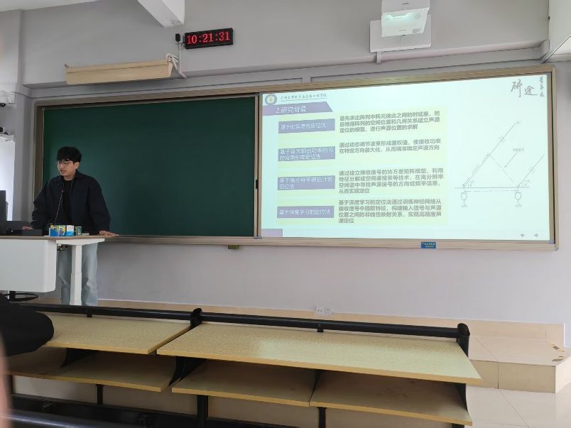 许展鹏同学汇报的主题是基于相干扩散比加权时延特征和深度学习的室内声源定位算法,他的讲解主要包含以下3个部分:研究意义及背景、研究内容、研究结果与应用。汇报介绍了一种基于多子带CDR加权时延特征与 SpecSE-ResNet 的室内DOA估计方法。CDR加权能够在保留直达声成分及其他高相干成分的同时,有效抑制混响与噪声。SpecSE-ResNet 可沿通道维与子带维自适应增强特征表示,实现端到端的高精度回归,并在复杂声学条件下保持较高的定位准确率。仿真与真实录音实验结果表明,与传统方法及常见深度学习基线相比,所提方法具有更强鲁棒性,在低SNR与高RT60场景下的性能退化最小。该方法在精度、鲁棒性与跨场景泛化方面表现突出,可为室内声源定位提供可靠的工程化解决方案。