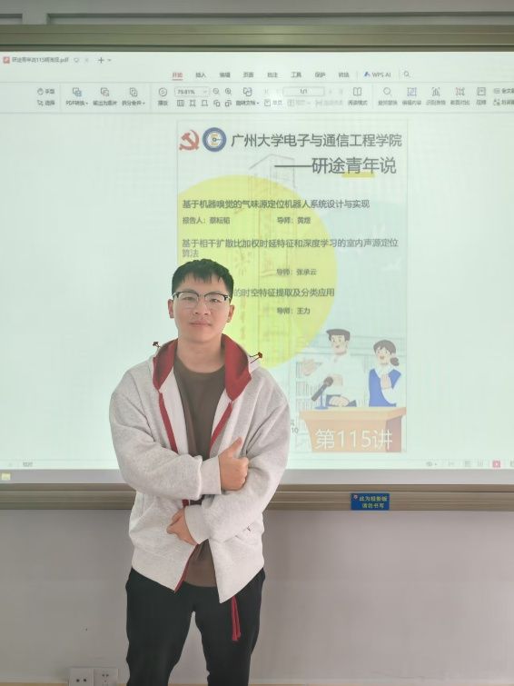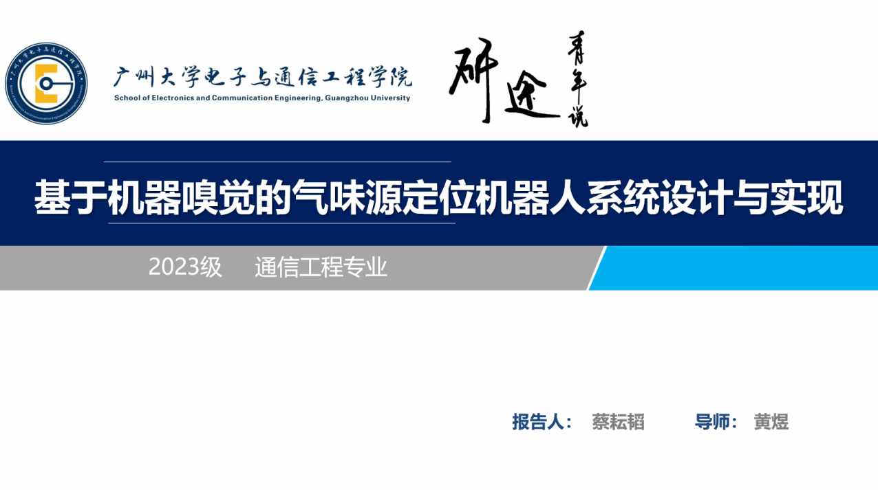 蔡耘韬同学汇报的主题是基于机器嗅觉的气味源定位机器人系统设计与实现,他的讲解主要包含以下6个部分:选题背景及意义、现状与研究目标、研究方法及过程、关键技术与实践难点、研究结果与应用、论文总结。汇报围绕环境监测、泄漏检测等场景的气味源定位需求展开,针对传统方法高成本、危险性大、受环境局限的问题,探索机器人主动嗅觉技术。研究搭建了含 MQ-3 乙醇传感器的机器人平台,采用螺旋式扩展搜索、浓度梯度追踪策略,结合改进算法优化定位效果。通过两轮实验验证,系统可精准定位气味源,且定位时间随机器人与气味源距离增加呈显著增长趋势。该研究为挥发性化学源快速定位提供了新的技术方案,适用于空气污染监测、泄漏定位等场景,具有实际应用价值。