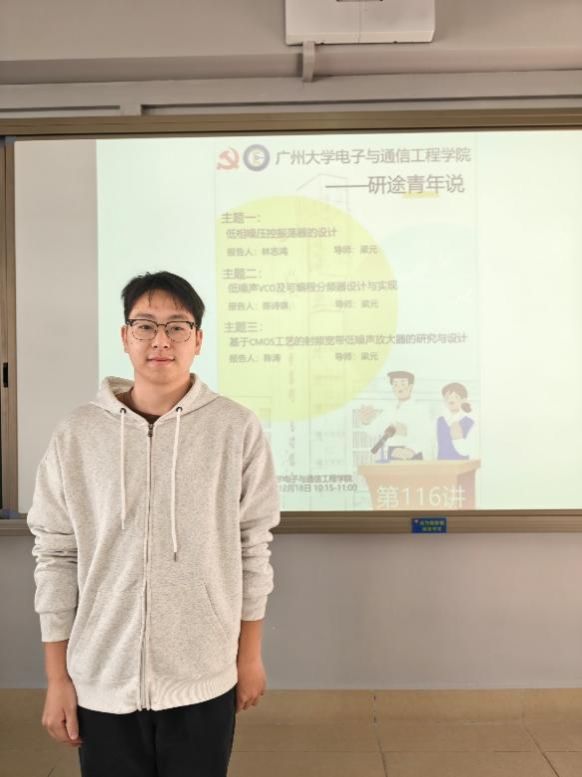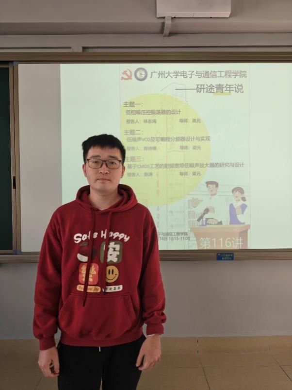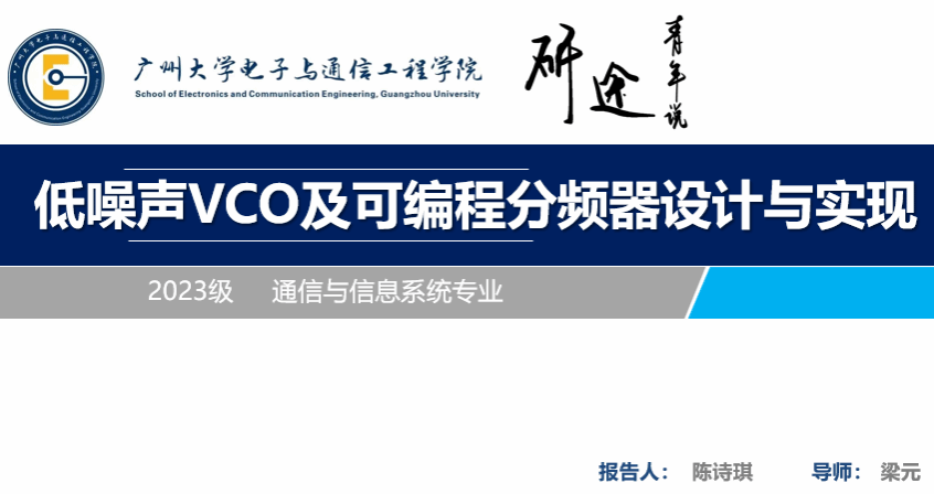 林志鸿同学汇报的主题是低相噪压控震荡器的设计,他的讲解主要包含以下6个部分:选题背景及意义、现状与研究目标、研究方法及过程、关键技术与实践难点、研究结果与应用、论文总结。 围绕低相噪压控振荡器(VCO)设计展开,聚焦 65nm CMOS 工艺双频段低相噪 VCO 研发。阐述通信技术发展对 VCO 的需求及其实践意义,分析国内外研究现状与不足,明确双频段覆盖、低相噪等核心目标。介绍理论分析、仿真设计、实验测试的研究方法,详解低相噪 LC-VCO 优化、倍频器设计、低噪声电源搭建三大关键技术。展示电路性能达标情况及在 6G、毫米波雷达等场景的应用前景,总结课题对相关领域的技术参考价值。