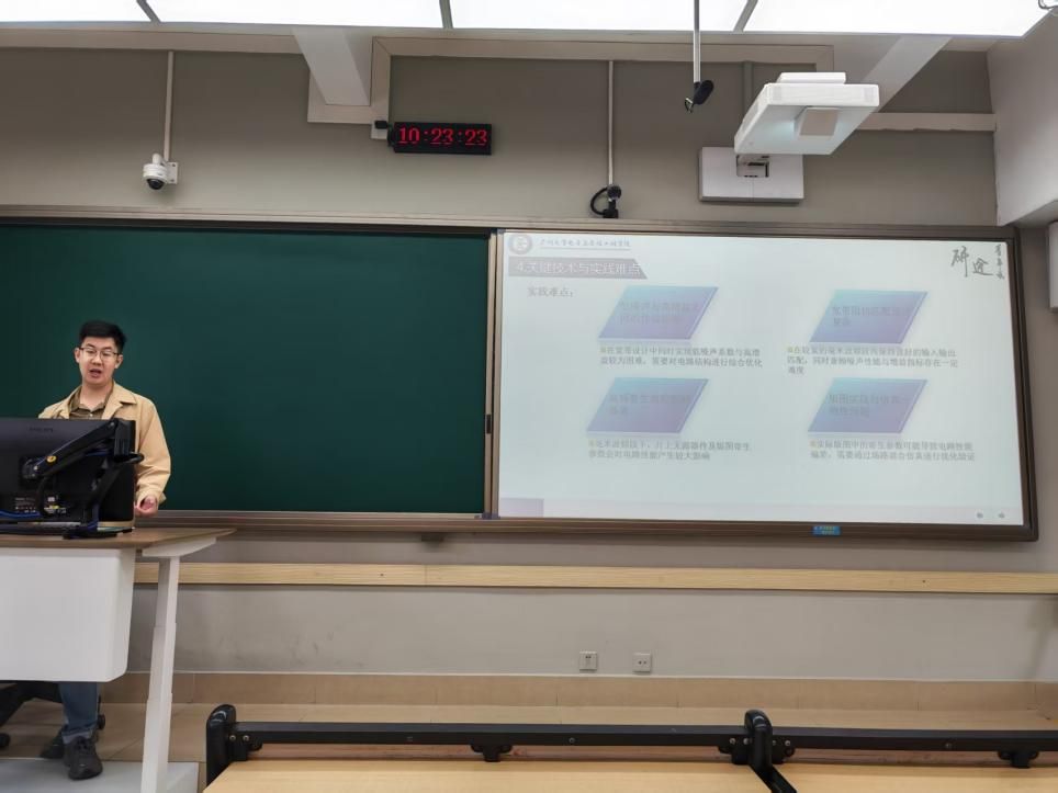 陶婧同学汇报的主题是双频高效率射频功率放大器,她的讲解主要包含以下5个部分:选题背景及意义、现状与研究目标、研究方法及过程、研究结果与应用、总结。研究针对现代无线通信系统调制信号的高峰均比特点及多种无线通信标准共存的特点,融合双频匹配技术和效率提升技术,设计应用于现代无线通信系统的具备双频高效率特点的功率放大器。研究主要包括:1)设计双频阻抗匹配电路同时兼顾双频谐波控制,以实现功率放大器的双频带工作同时提升工作效率;2)将双频匹配技术与异相功率放大器相结合,实现具备双频工作频率的异相功率放大器